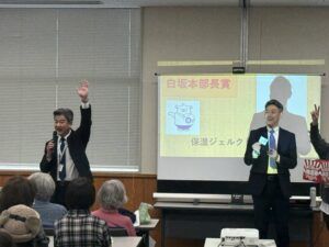 冒頭に弊社取締役営業本部長である白坂嘉通より、創業100周年に健康イキイキ講座を開催する意味と、支えてくださったお客様へ感謝の挨拶をさせていただきました。