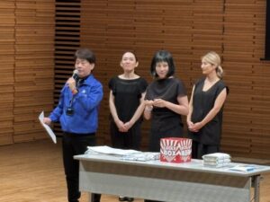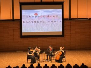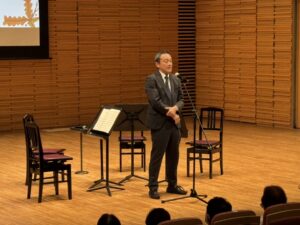 創業100周年を迎えた当社が、「なら100年会館」で開催する記念すべき今回のイキイキ講座は、冒頭に弊社代表取締役社長 原浩之から創業100周年のご報告、支えてくださったお客様や関係者の方々への感謝の挨拶でスタートしました。第一部では、原社長、プロ音楽家の石上真由子さん、北見春菜さん、飯尾久香さんの弦楽四重奏で映画音楽、クラシックなどを披露し、後半には「赤とんぼ」、「紅葉」といった学校唱歌を参加いただいたお客様全員と合唱しました。また、当社100周年のお祝いとして石上さんアレンジの「ハッピーバースデー」を独奏していただきました。その後、原社長と医師免許をお持ちの石上さんのトークショーが行われ、恒常性の話や石上さんにお使いいただいている当社製品のヘルストロンについて話がありました。